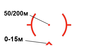 Прицельная сетка типа DCR представляет собой рассеченный круг в 65 МОА с точкой в 1 МОА и шеврон для быстрой стрельбы на минимальные дистанции. На картинке даны точки попадания пули при пристрелке центральной точки в 50 или 200 м, основываясь на патроне .223 калибра весом в 4 грамма и начальной скоростью 884 м/с.